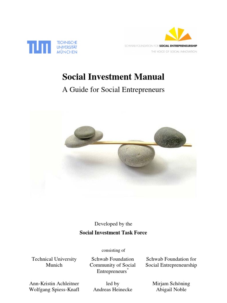 The Social Investment Manual will be revised regularly and the most recent version can be found at http://www.schwabfound.org/pdf/schwabfound/SocialInvestmentManual.pdf. * Please see page 52 for an overview of the task force members of the Schwab Community which contributed to the development of this document. We look forward to your comments or suggestions. Please contact wolfgang.spiess-knafl@wi.tum.de and abigail.noble@schwabfound.org We would like to thank Miriam Al-Ali, Andrea Coleman, Gene Falk, Pradeep Jethi, Victoria Kisyombe, Lisa Mller, Reed Paget, Amitabha Sadangi, Sarah Volk, Heinrich Weninger, Arthur Wood (in alphabetic order) and all participants of the workshop on Social Investment organized by the Schwab Foundation for their contributions and their willingness to discuss some of the key issues.